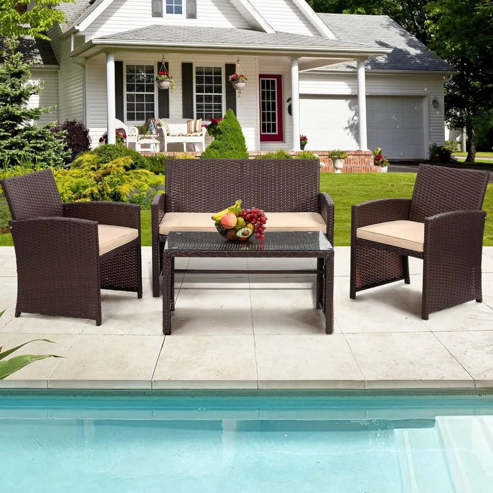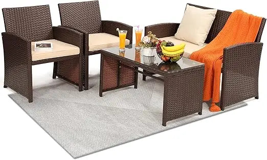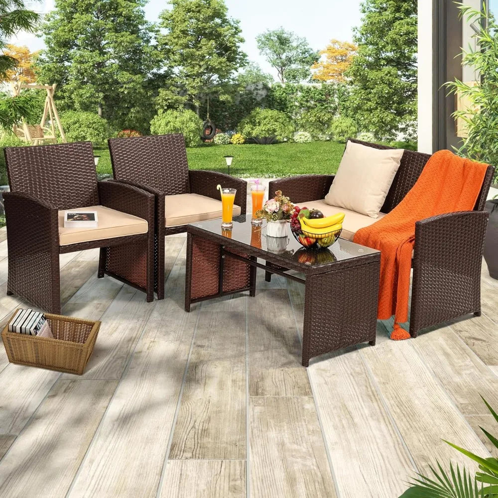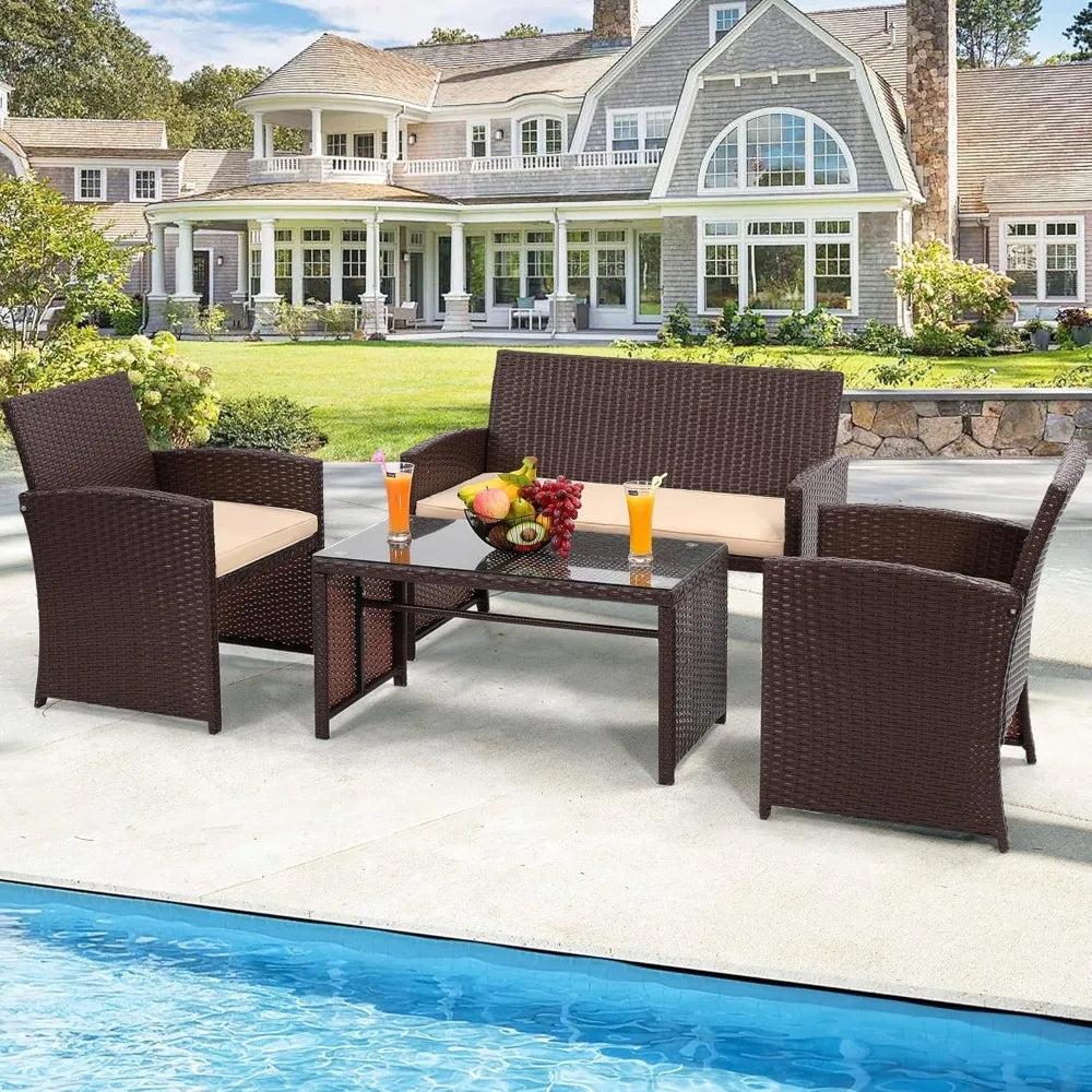4 Piece Rattan Patio Furniture Set with Cushioned Sofa for Garden and Porch